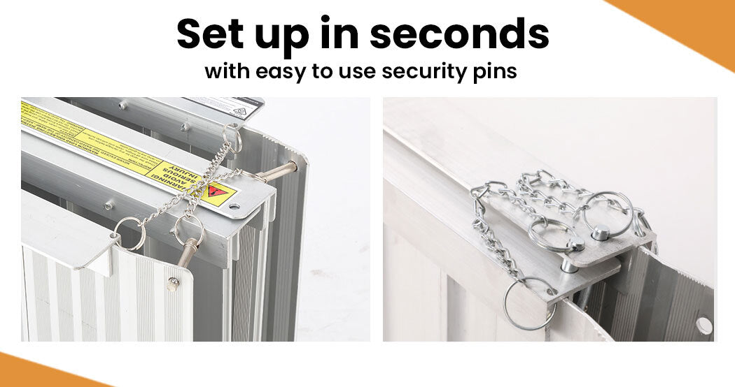 Equipmed ramps are expertly machine welded with non-slip serrated slats and side rails for peace of mind. The ramp comes complete with 2 x locking pins that keep it folded when carrying, and can be used for securing ramps during loading/unloading to drilled holes.