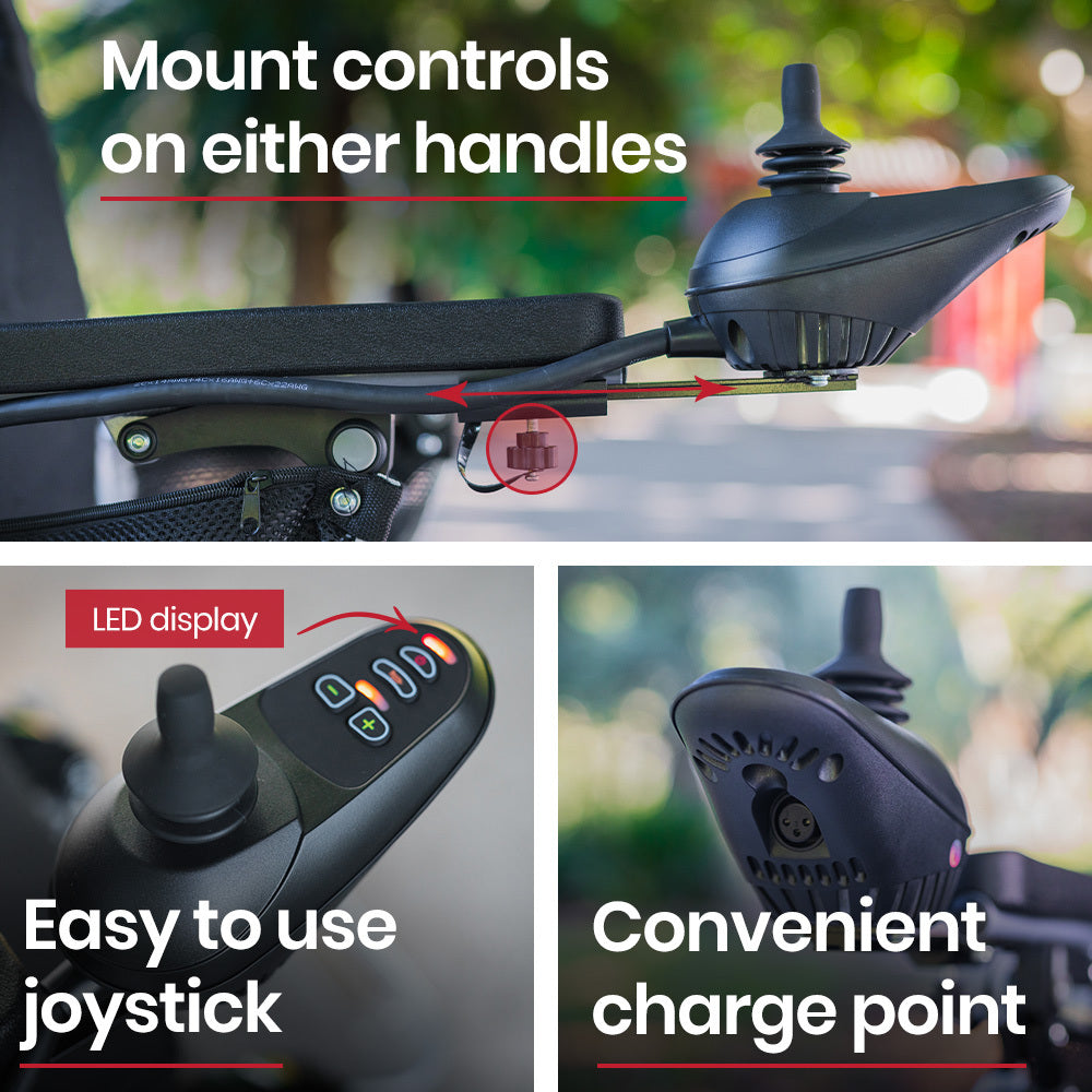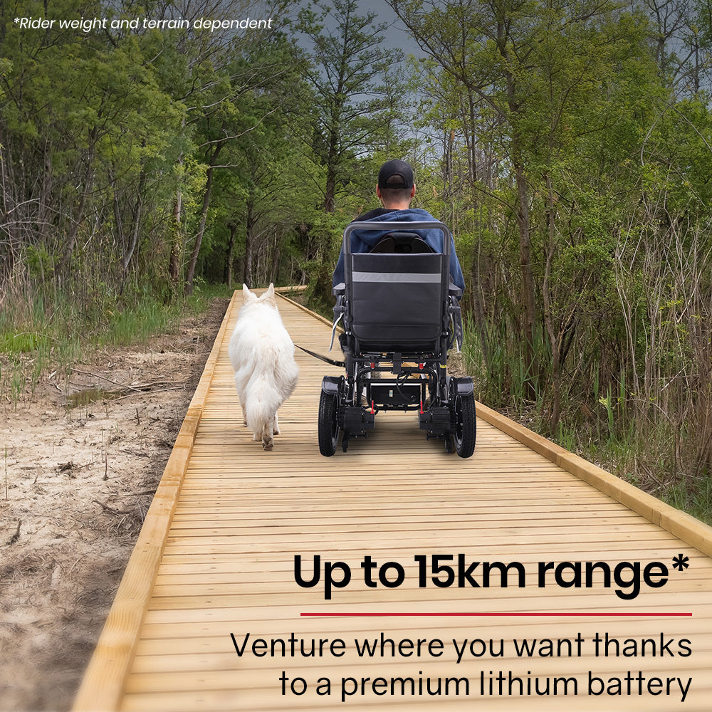 Twin motors offering a total of 500 watts offer an enjoyable riding experience with smooth and responsive performance, not to mention the ability to climb hills and ramps right up to a 15-degree incline! A tight 1m turning circle offers the manoeuvrability you need on paths and in places like shopping centres and airports.